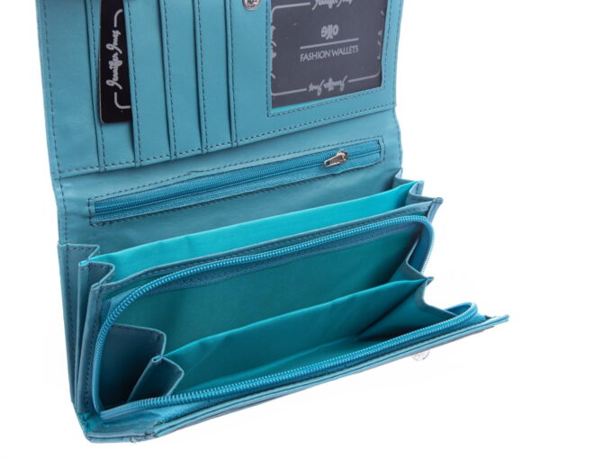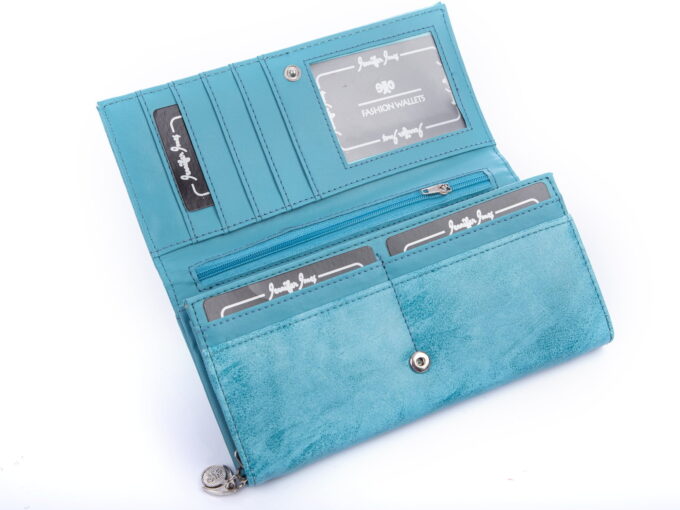 - Duży elegancki portfel damski niemieckiej marki Jennifer Jones w pastelowym kolorze turkusowym (błękitnym).