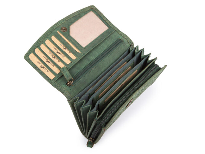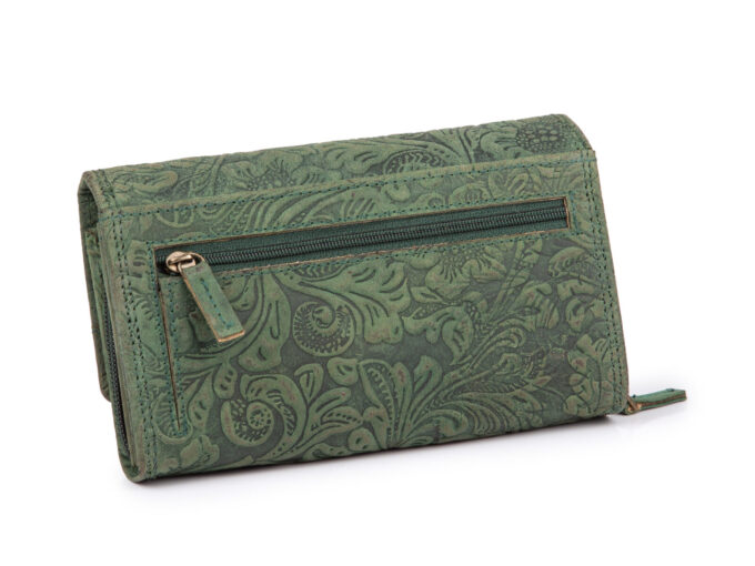 - Poziomy portfel damski, zielony, z pięknym tłoczeniem w kwiaty „floral” w stylu vintage.
