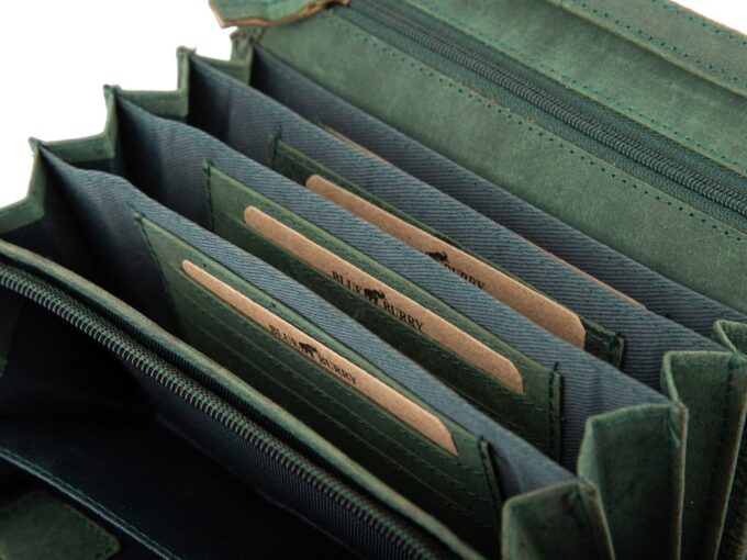 Poziomy, zielony portfel damski marki Blue Burry z grubej zamszowej skóry naturalnej i dekoracyjnym tłoczeniem w kwiaty — zamykany na solidny metalowy zatrzask, z 17 nieprzezroczystymi i 2 przezroczystymi kieszonkami, 4 przegrodami na banknoty, kieszeniami zapinanymi na zamek oraz dodatkowymi schowkami, sprzedawany w eleganckim pudełku i idealny jako praktyczny prezent. Pełna specyfikacja ⬇