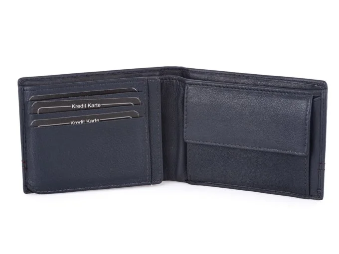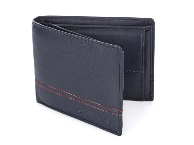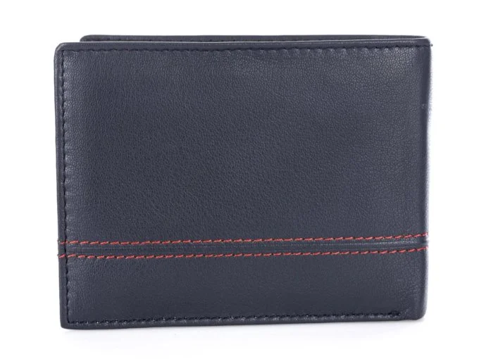Elegancki portfel męski wykonany z wysokiej jakości skóry naturalnej. Portfel w kolorze granatowym z delikatnym akcentem w postaci dwu rzędowego szwu w kolorze czerwonym. Pełna specyfikacja ⬇