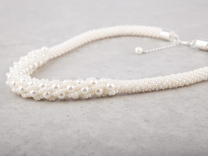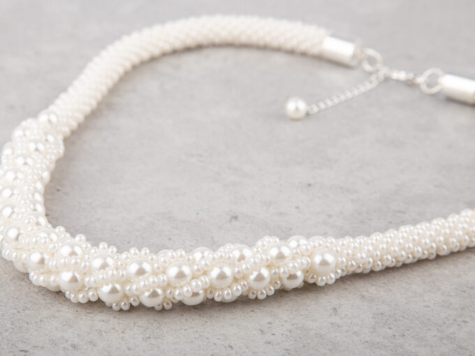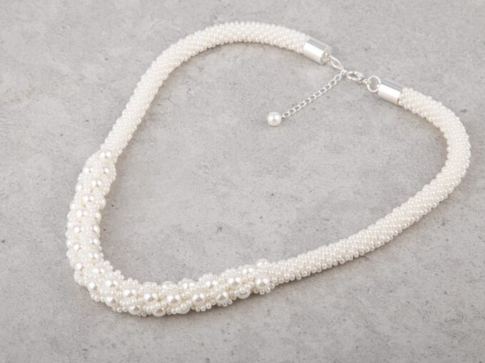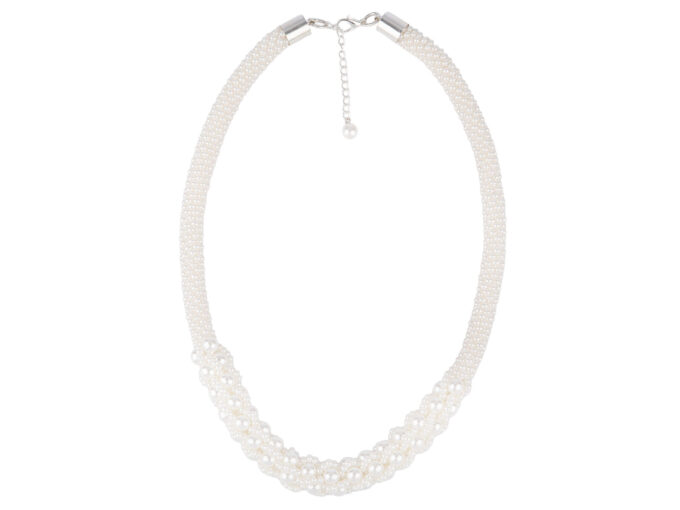 Starannie, ręcznie pleciony naszyjnik z drobnych, białych perełek Preciosa, które tworzą efektowny i elegancki splot. W dolnej części kompozycja przechodzi w dekoracyjne przeplatanie większych perełek, co nadaje całości przestrzenności i podkreśla ekskluzywność dodatku. Dzięki temu biżuteria przyciąga wzrok i sprawia, że jest to produkt na specjalne okazje. Regulowane zapięcie z karabińczykiem z łańcuszkiem zakończonym perełką pozwala idealnie dopasować długość naszyjnika do dekoltu i okazji.