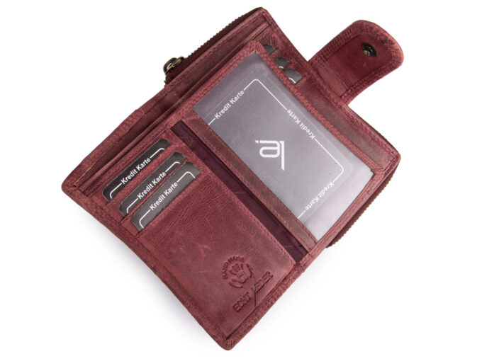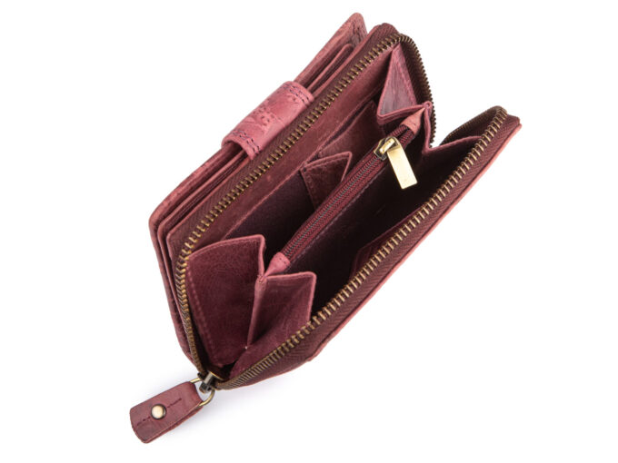 - Skórzany, ręcznie szyty, portfel damski w kolorze bordowym, stworzony w modnym stylu vintage.