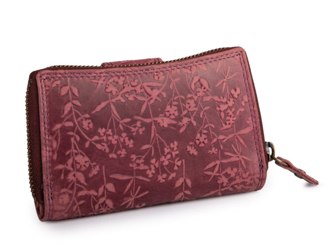 Ręcznie szyty portfel damski w kwiaty vintage skórzany bordowy RFID
