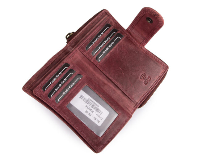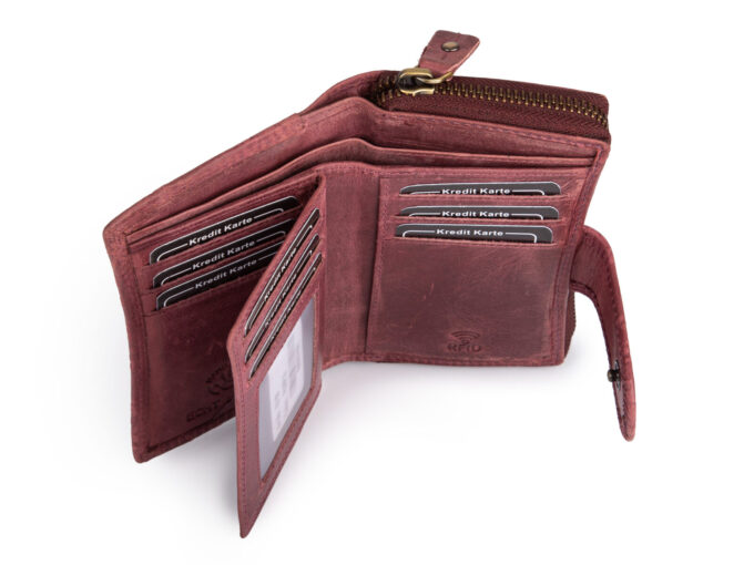 - Portfel wyposażony jest w ochronę RFID – blokującą dostęp z zewnątrz do znajdujących się wewnątrz portfela kart zbliżeniowych.