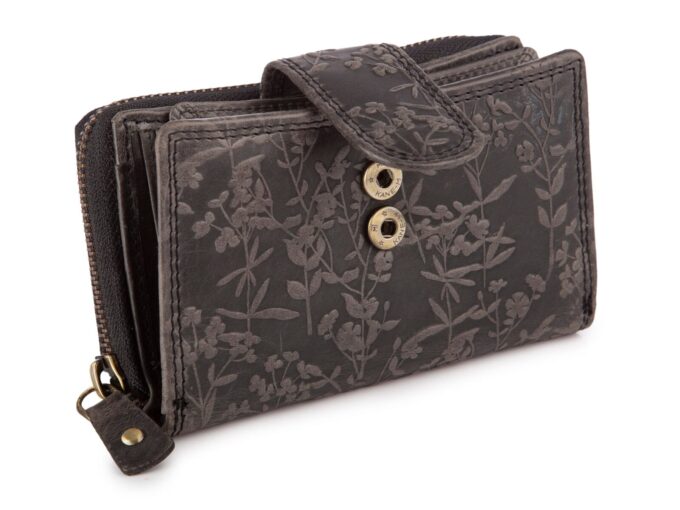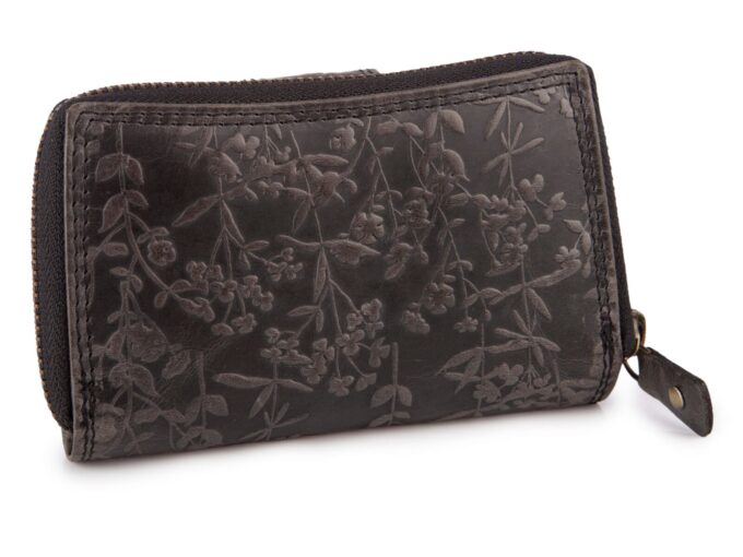 Ręcznie szyty portfel damski w kwiaty vintage skórzany czarny RFID