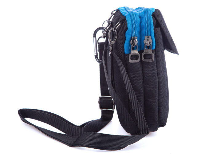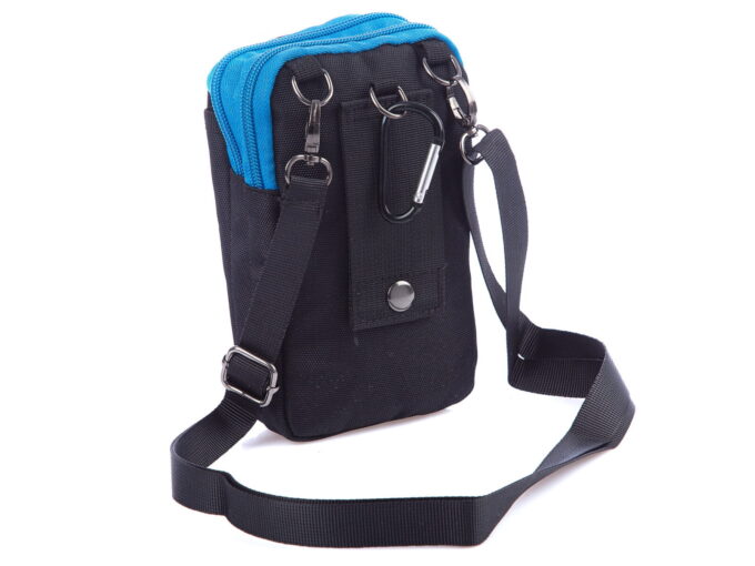 - Czarno-niebieska saszetka męska z mocowaniem na pasek i odczepianym paskiem na ramię.