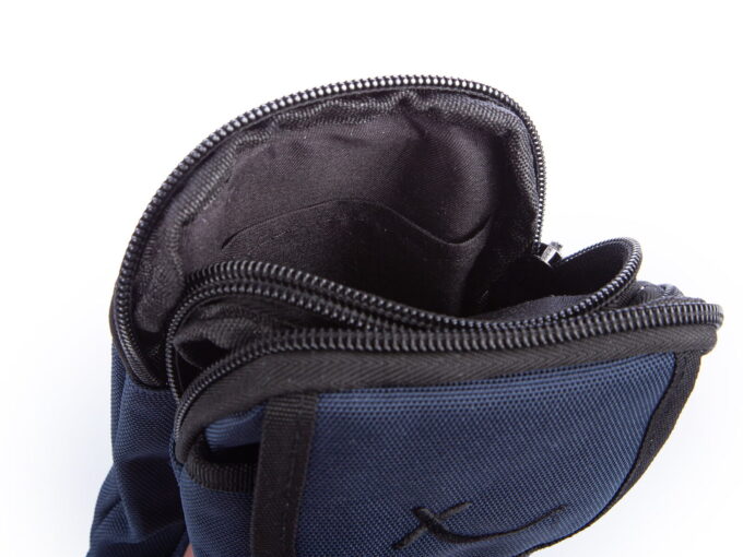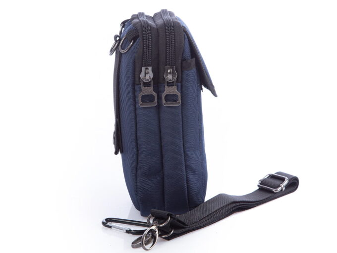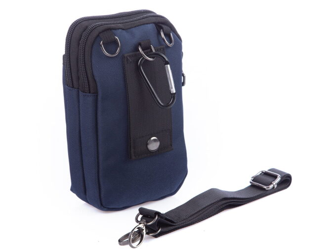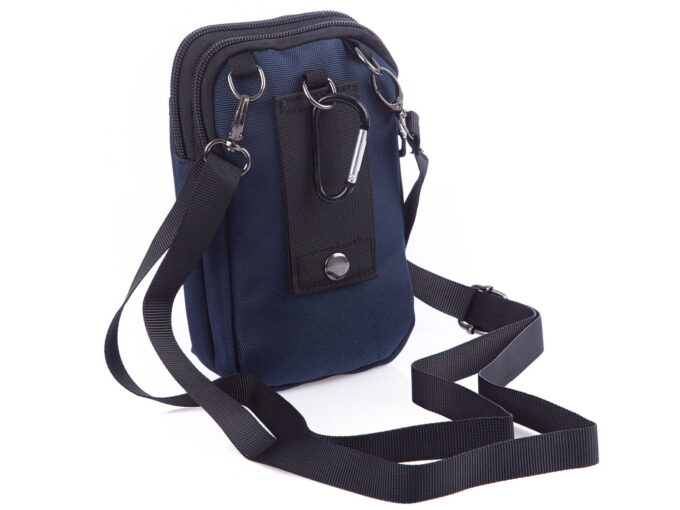 - Granatowa saszetka męska z mocowaniem na pasek i odczepianym paskiem na ramię.
