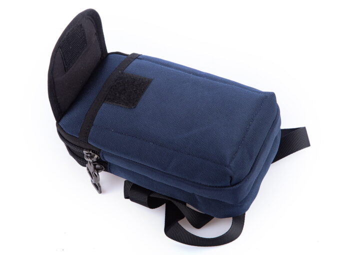 - Z przodu saszetki znajduje się podłużna pionowa kieszeń zamykana na klapkę z rzepem.
