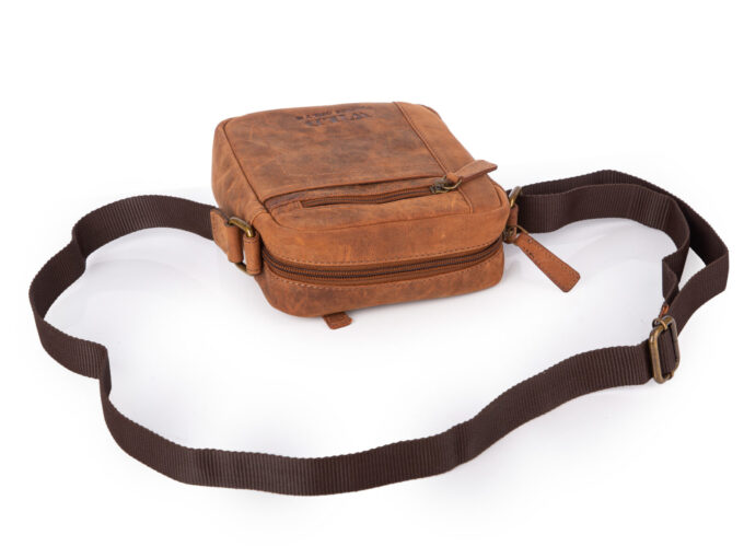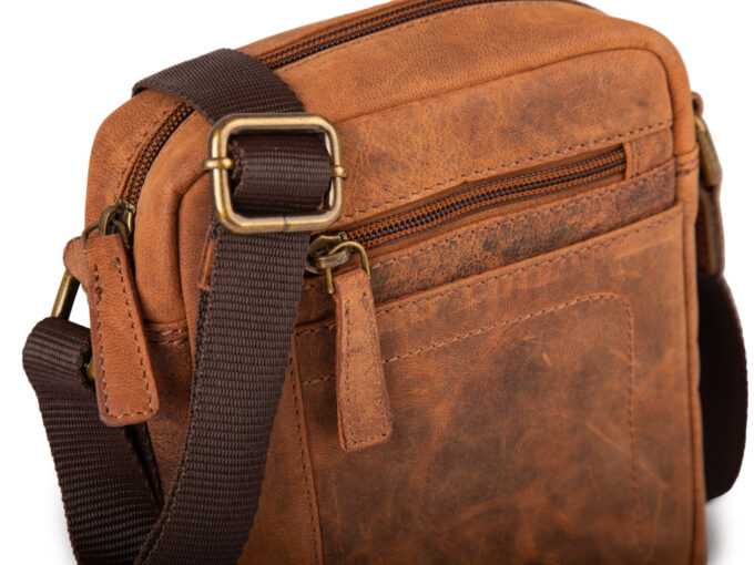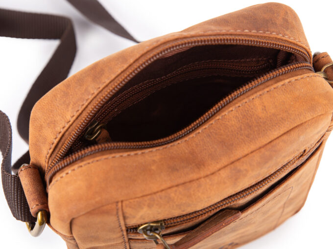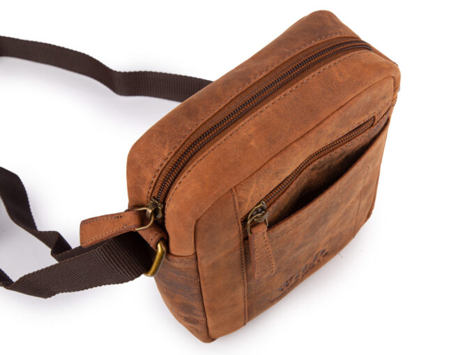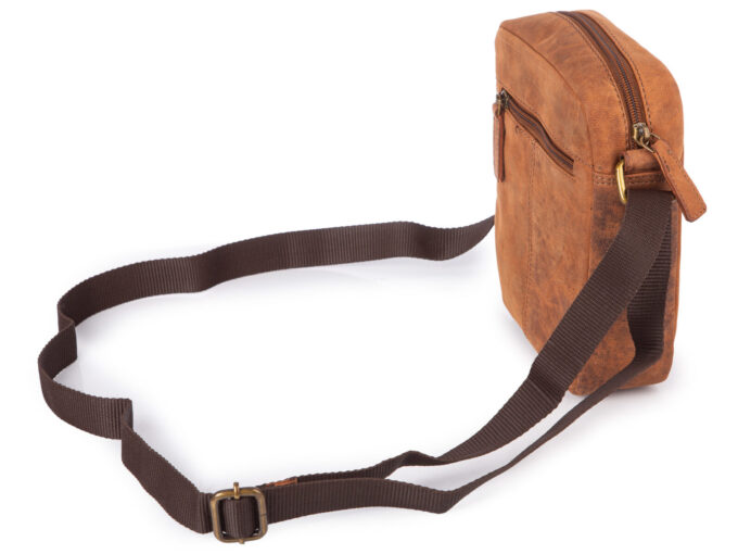 - Skórzana, brązowa torba męska na ramię typu listonoszka na co dzień.