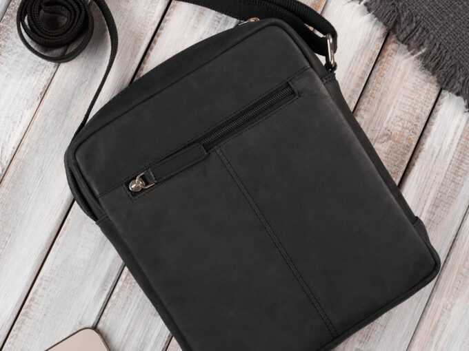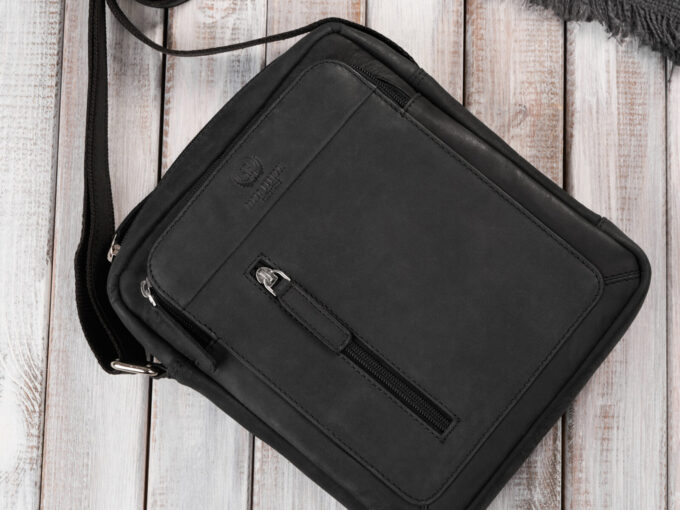 - Skórzana listonoszka męska z paskiem na ramię w kolorze czarnym.