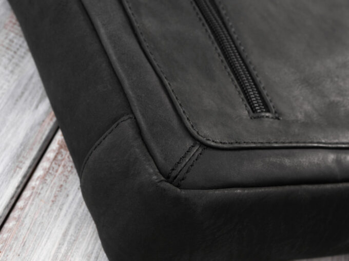 - Torba wyposażona jest w długi i regulowany pasek na ramię wykonany ze skóry naturalnej podszytej warstwą zabezpieczającego materiału.