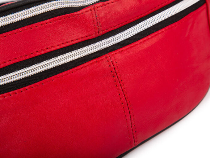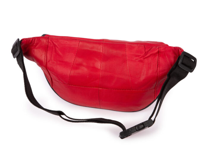 - Skórzana saszetka biodrowa typu nerka w kolorze czerwonym.