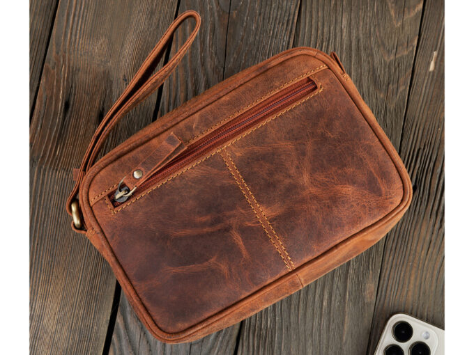 - Elegancka, skórza saszetka męska z paskiem do ręki, w kolorze brązowym.