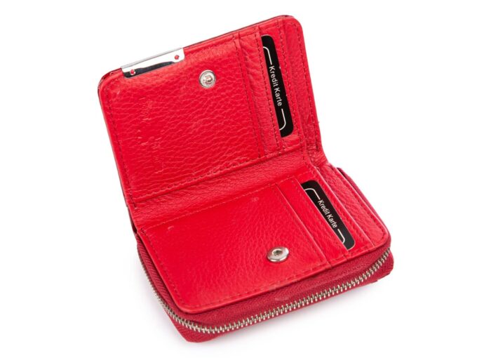- Wnętrze portfela wykonane z matowej skóry naturalnej, także w kolorze czerwonym.