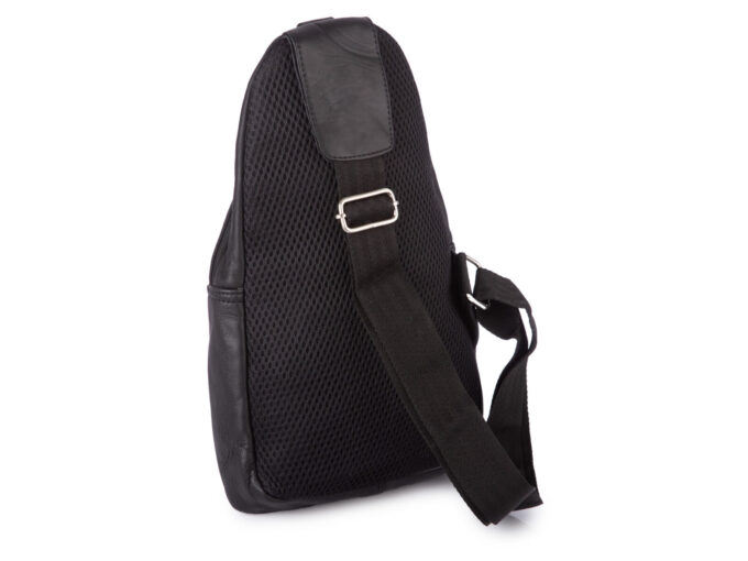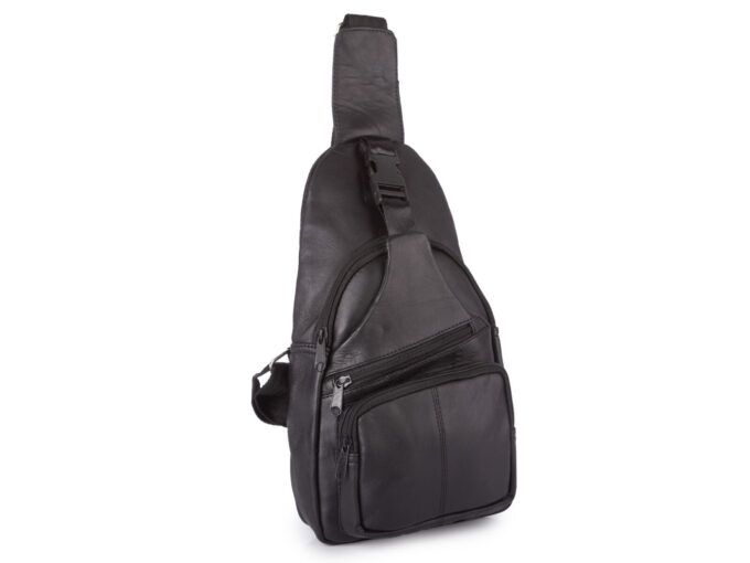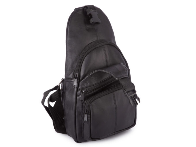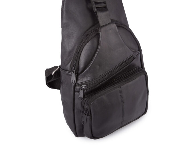 - Czarny, skórzany plecak na jedno ramię, typu „crossbody”.