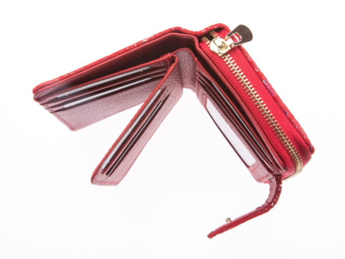 Czerwony błyszczący portfel damski z brokatem z kieszenią na bilon zamykaną na suwak