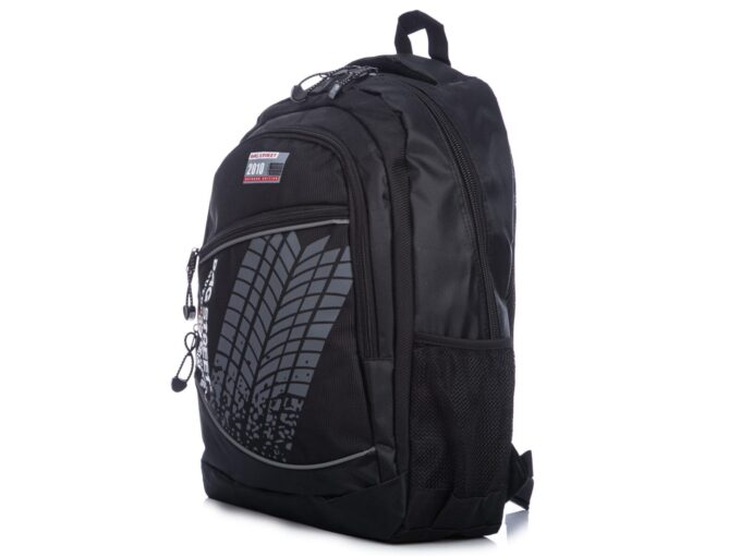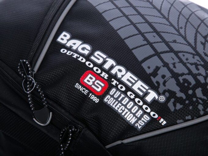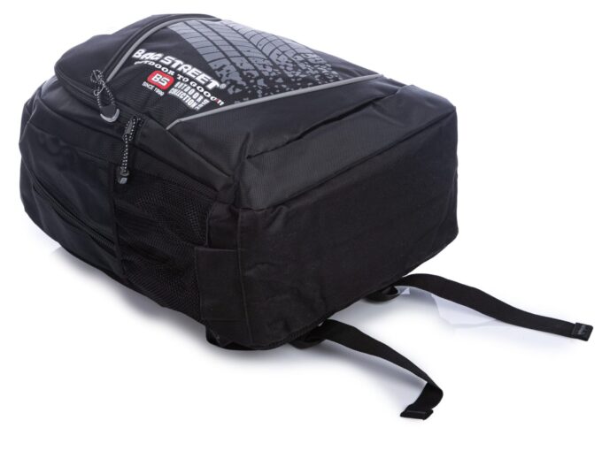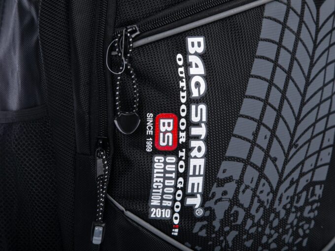 Czarny plecak Bag Street to doskonałe połączenie funkcjonalności i stylu. Wyprodukowany przez renomowaną niemiecką markę, został uszyty z mocnego materiału, który doskonale chroni przed przemakaniem. Główna, obszerna komora plecaka, zabezpieczona mocnym suwakiem, kryje w sobie dodatkową przegrodę – idealną na teczki czy laptopa. Druga, nieco mniejsza komora, również na zamek błyskawiczny, świetnie sprawdzi się do przechowywania dodatkowych akcesoriów. Po bokach umieszczone zostały dwie siateczkowe kieszonki na napoje czy drobiazgi, a frontowy panel zdobi praktyczna kieszeń oraz dekoracyjna, motoryzacyjna aplikacja imitująca ślad opony. Plecak charakteryzuje się solidnym wykonaniem – nienaganna estetyka podkreślona jest przez staranne przeszycia i poukrywane szwy. Komfort noszenia gwarantuje usztywniony tył z oddychającą siateczką, a dodatkowy uchwyt na górze ułatwia przenoszenie w dłoni lub zawieszenie na haku.