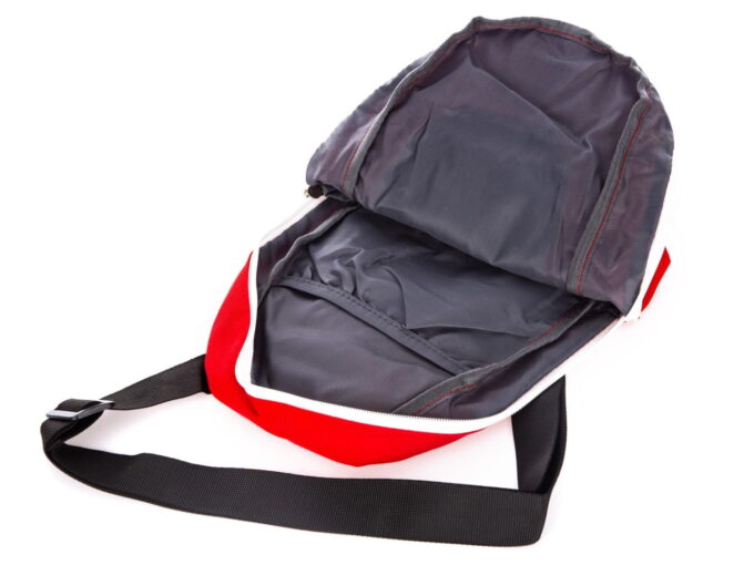 - Plecak posiada możliwość noszenia na lewym lub prawym ramieniu – wystarczy przepiąć pasek do odpowiedniego uchwytu znajdującego się z tyłu.