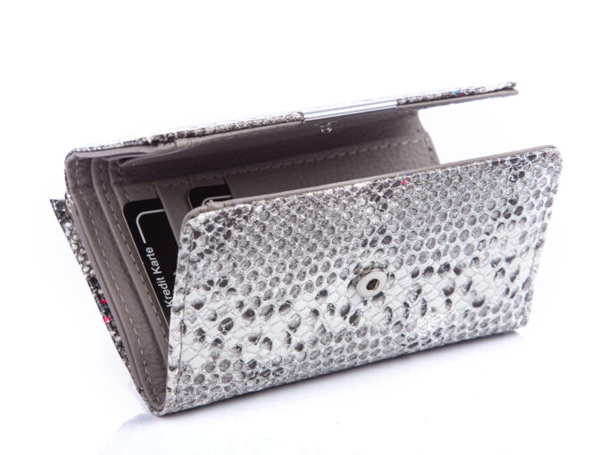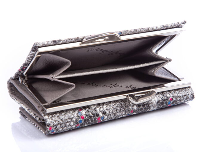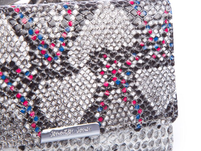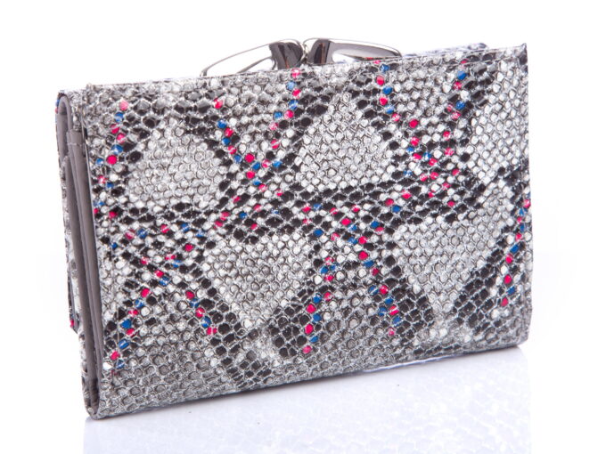 - Portfel damski niemieckiej marki Jennifer Jones, wykonany ze skóry naturalnej w kolorze srebrnym z kolorowymi, różowymi i niebieskimi kropeczkami z wzorem imitującym skórę węża.