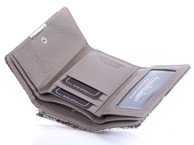 - Całość portfela przeznaczona na banknoty i karty zapinana jest na patkę z mocnym, metalowym zatrzaskiem.