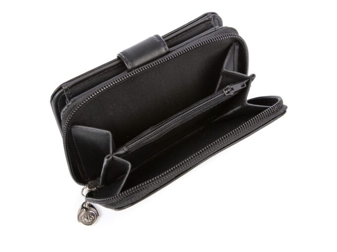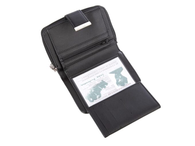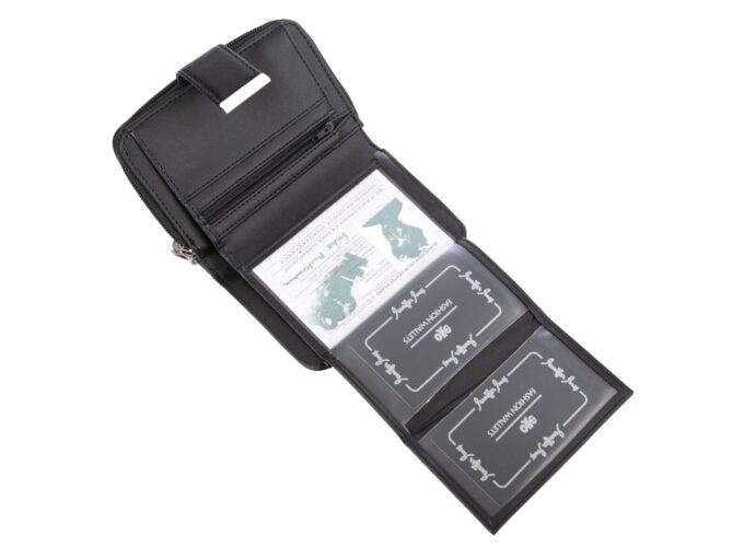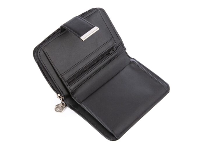 Ten praktyczny portfel zaprojektowano z myślą o organizacji i bezpieczeństwie. Przednia część portfela elegancko zapinana jest na paseczek z metalowym zatrzaskiem. Portfel posiada dużą, funkcjonalną kieszeń na bilon, zapinana na zamek błyskawiczny i podzieloną na pół, co ułatwia zarządzanie monetami. Ponadto portfel wyposażony jest w przegrodę na banknoty, kieszonkę na suwak dla dodatkowego bezpieczeństwa, trzy przezroczyste kieszonki na karty, dokumenty i zdjęcia oraz trzy dodatkowe schowki na karty płatnicze. Portfel sprzedawany jest w eleganckim, firmowym pudełku, co czyni go doskonałym pomysłem na prezent. Jego wymiary – szerokość 13 cm, wysokość 9 cm i głębokość 3 cm – zapewniają kompaktowość, przy zachowaniu odpowiedniej pojemności.