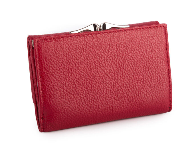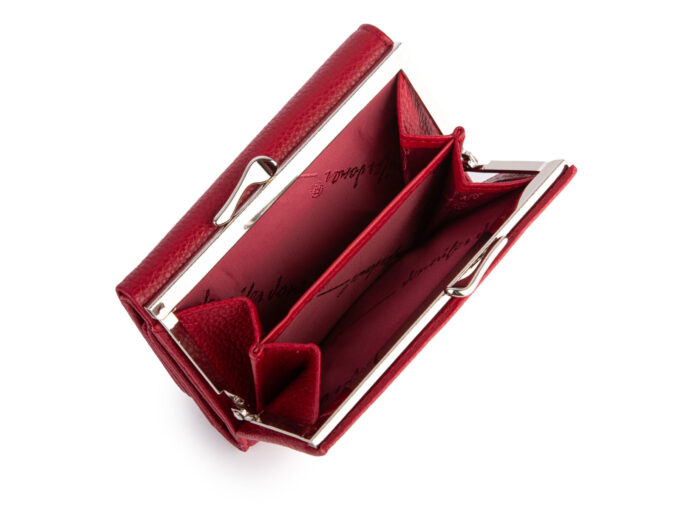 - Średniej wielkości portfel damski w kolorze czerwonym z kieszenią na monety zapinaną na bigiel.