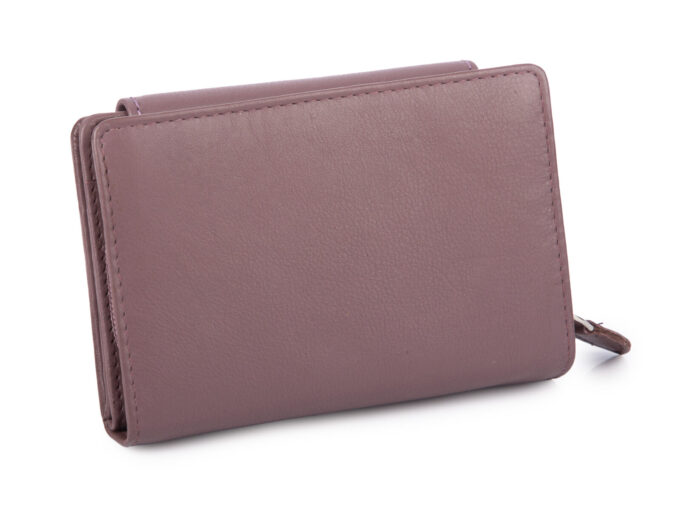 - Średni portfel damski wykonany z miękkiej skóry naturalnej w oryginalnym kolorze mauve będącym połączeniem fioletu i brązu.