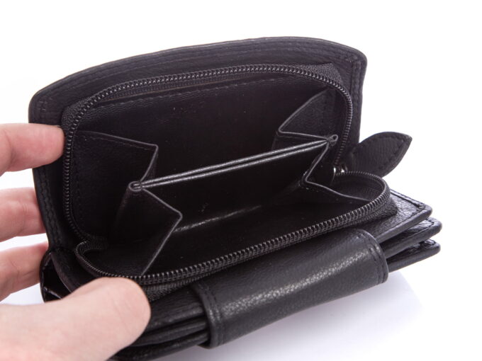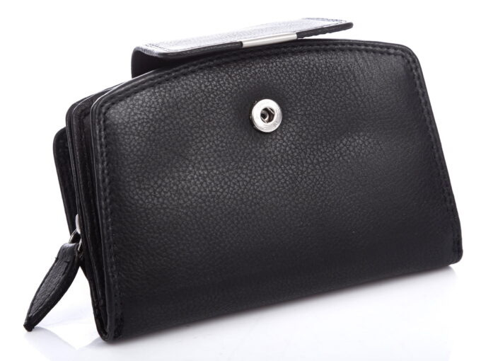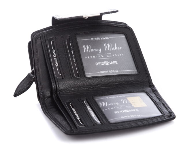 Średni skórzany portfel damski z ochroną zbliżeniowych kart płatniczych, tzw. blokadą RFID, czarny. Uszyty starannie z miękkiej skóry naturalnej z mocnymi i wytrzymałymi metalowymi okuciami. Portmonetka wyposażona jest w dwie przegrody na banknoty, dużo miejsc na karty, oraz podwójną kieszeń na monety zapinaną dookoła na suwak. Produkt niemieckiej marki Money Maker.