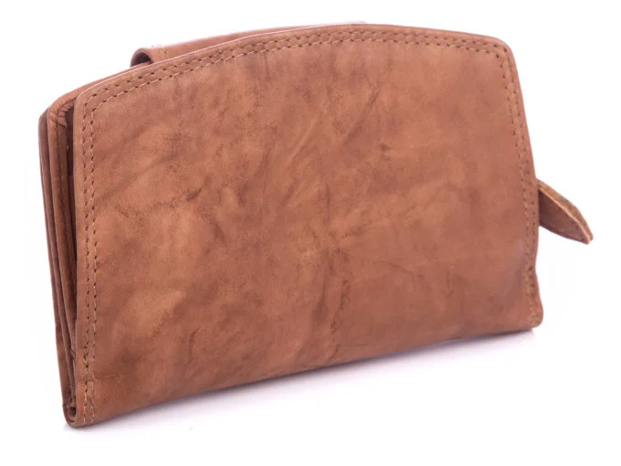 - Skórzany portfel damski średniej wielkości w kolorze jasnobrązowym.
