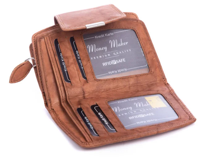 Średni skórzany portfel damski z ochroną zbliżeniowych kart płatniczych, tzw. blokadą RFID, jasny brąz. Uszyty starannie z miękkiej skóry naturalnej z mocnymi i wytrzymałymi metalowymi okuciami. Portmonetka wyposażona jest w dwie przegrody na banknoty, dużo miejsc na karty, oraz podwójną kieszeń na monety zapinaną dookoła na suwak. Produkt niemieckiej marki Money Maker.