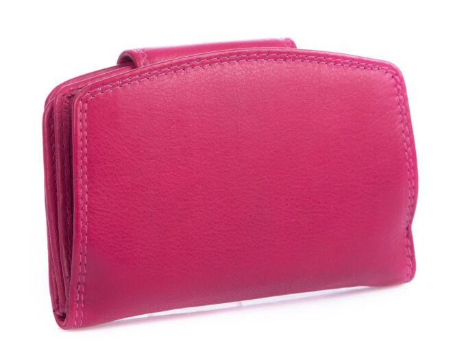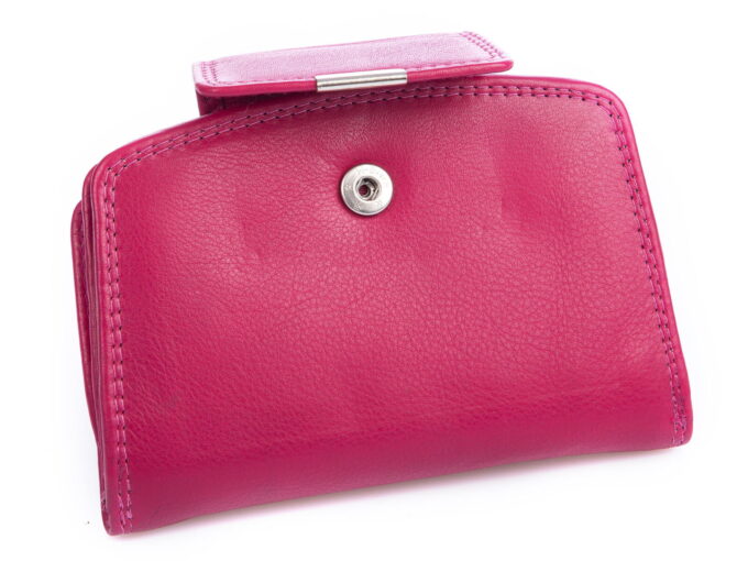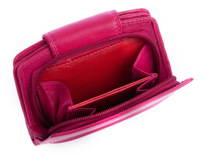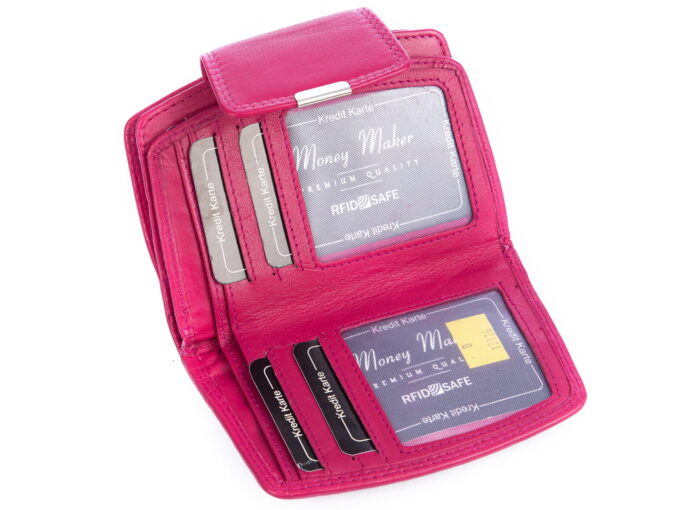Średni skórzany portfel damski z ochroną zbliżeniowych kart płatniczych, tzw. blokadą RFID, różowy. Uszyty starannie z miękkiej skóry naturalnej z mocnymi i wytrzymałymi metalowymi okuciami. Portmonetka wyposażona jest w dwie przegrody na banknoty, dużo miejsc na karty, oraz podwójną kieszeń na monety zapinaną dookoła na suwak. Produkt niemieckiej marki Money Maker.