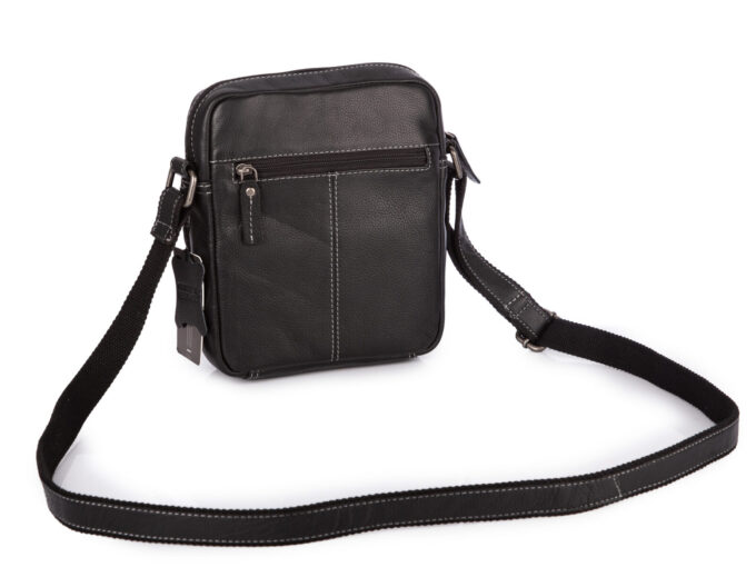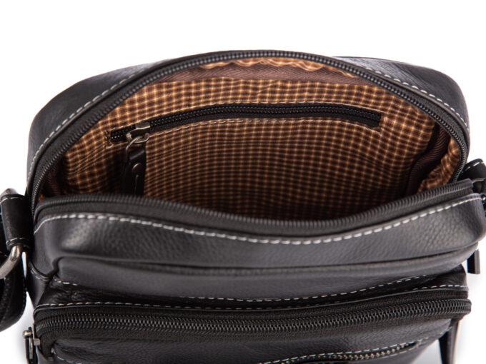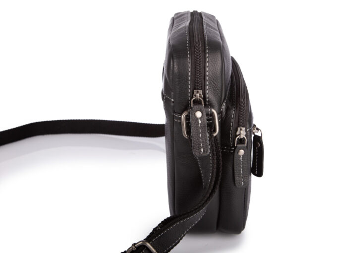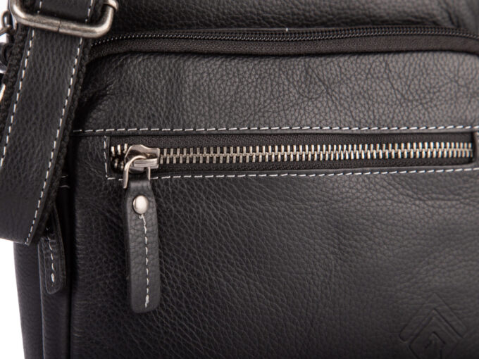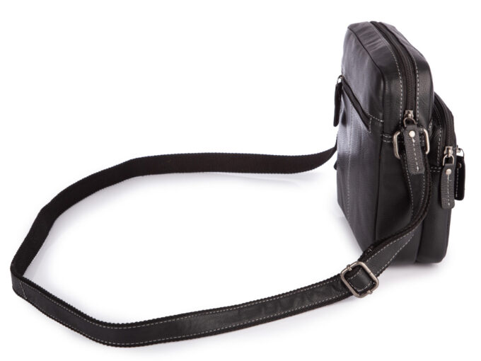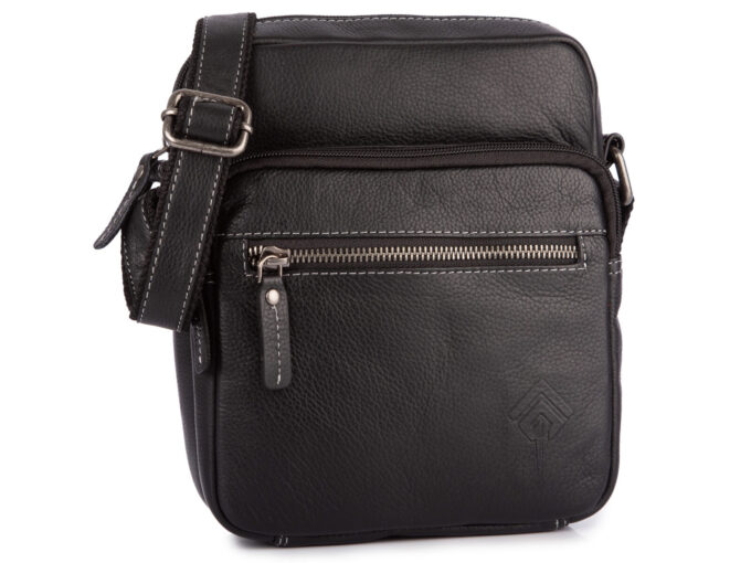 - Średnia, czarna torba męska na ramię uszyta ze skóry naturalnej.