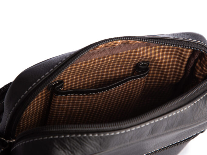 - Torba wyposażona jest w długi i regulowany pasek na ramię wykonany ze skóry naturalnej w kolorze torby podszytej mocnym materiałem zabezpieczającym przed przecieraniem.