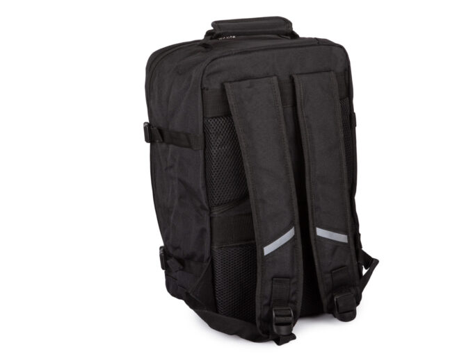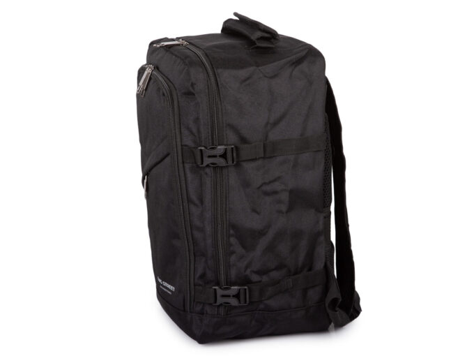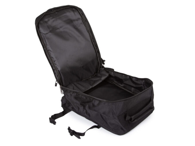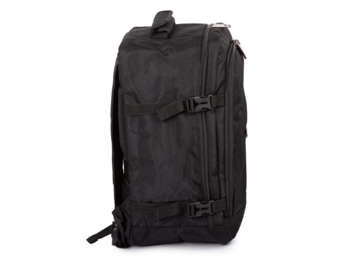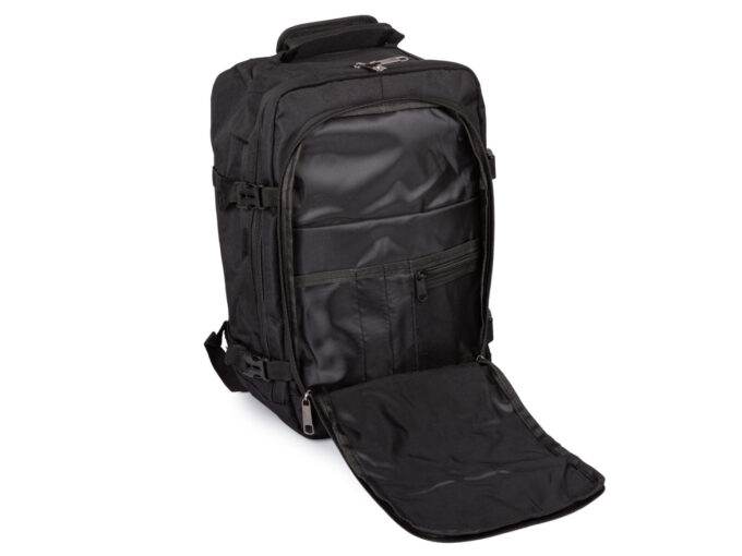 - Średniej wielkości, czarny plecak podróżny otwierany jak walizka.