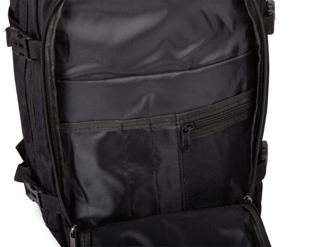 - Wewnątrz głównej komory można umieścić np. ubrania, jest wygodnie zapinana i zamykana podobnie jak walizka – po odpięciu zamka otwiera się pełny dostęp do całego wnętrza.