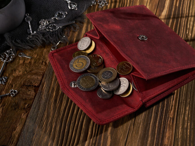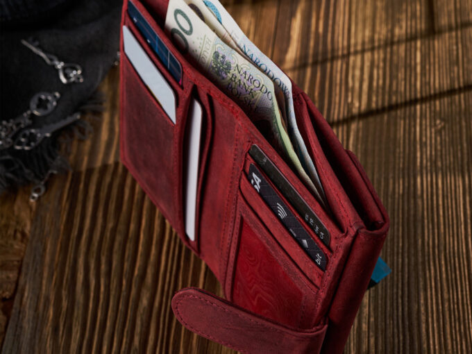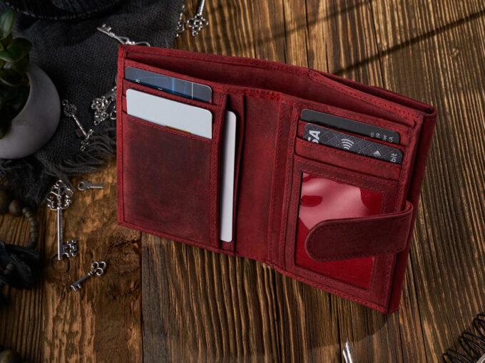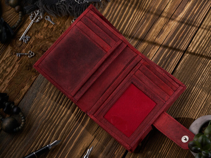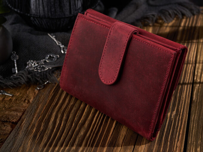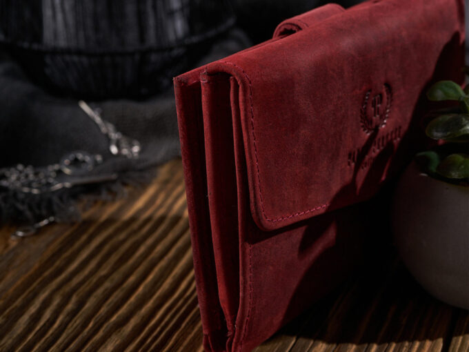 - Średniej wielkości czerwony portfel damski uszyty z surowej skóry naturalnej w stylu vintage.