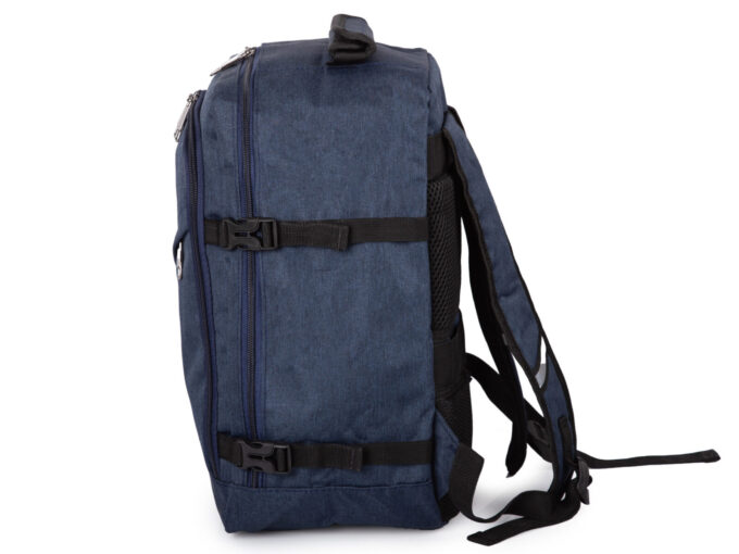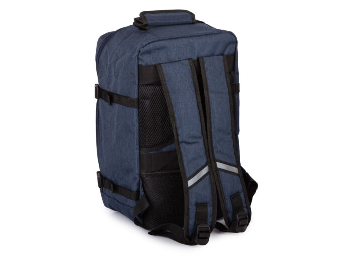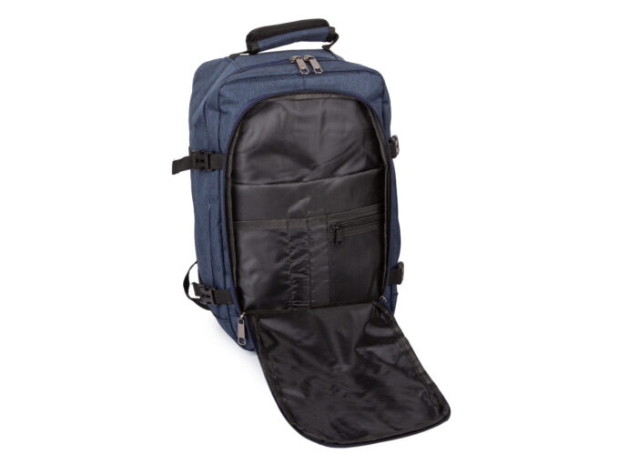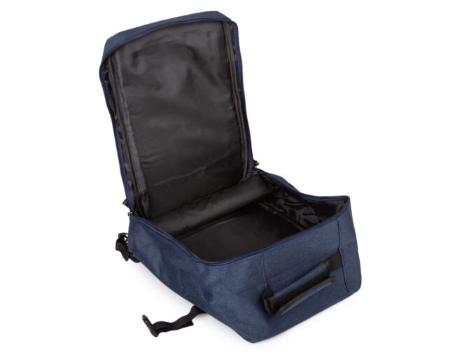 - Średniej wielkości, granatowy plecak podróżny otwierany jak walizka.