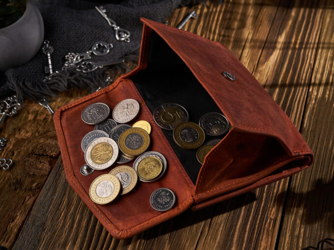 - Kieszeń na monety zamykana jest na trójkątną patkę z metalowym zatrzaskiem.