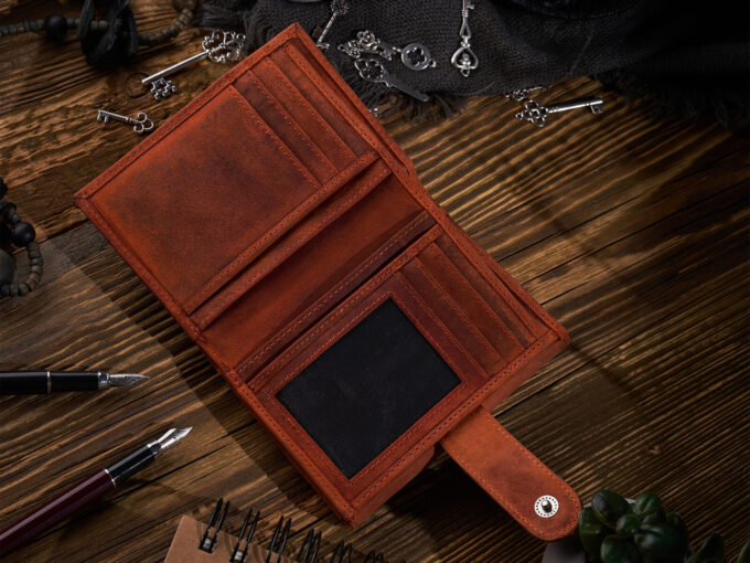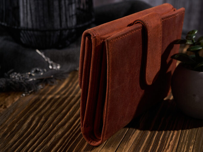 - Średniej wielkości jasnobrązowy (koniakowy) portfel damski uszyty z surowej skóry naturalnej w stylu vintage.