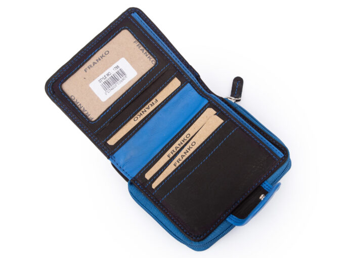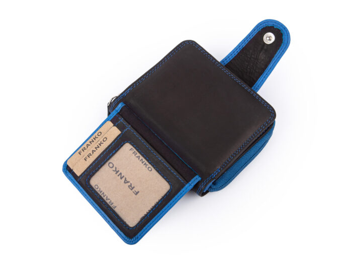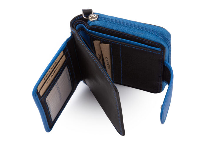 Średniej wielkości, skórzany portfel damski czarno-niebieski Franko