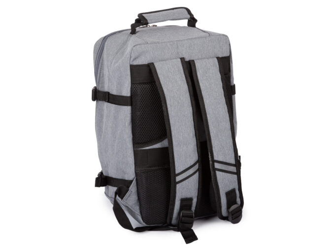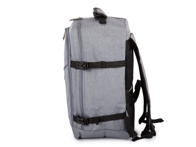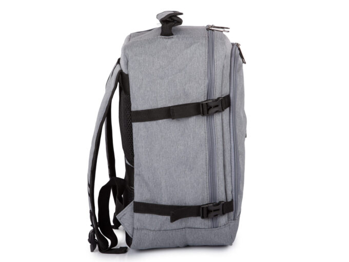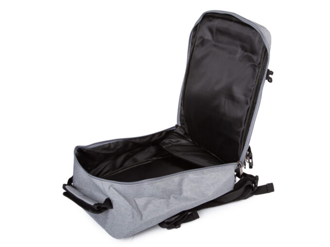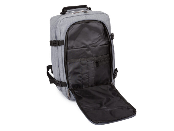 - Średniej wielkości, szary plecak podróżny otwierany jak walizka.