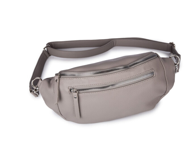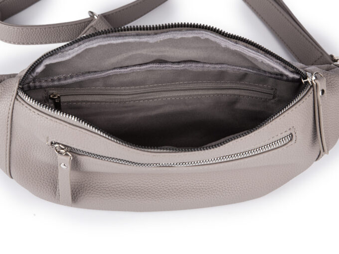 - Duża szara saszetka damska typu nerka z paskiem na ramię.