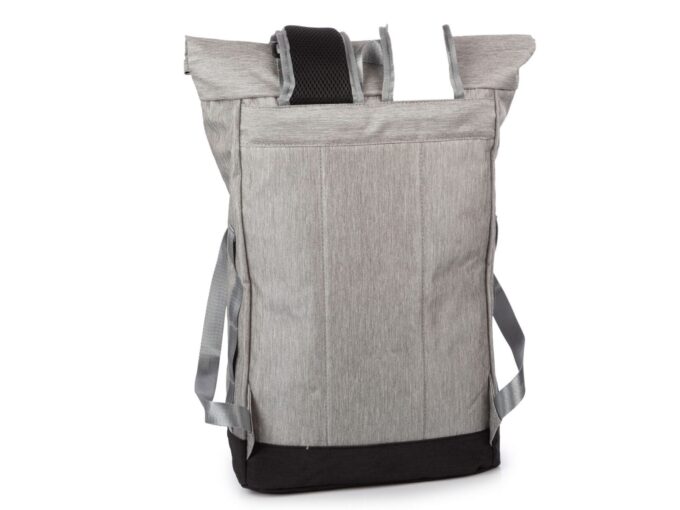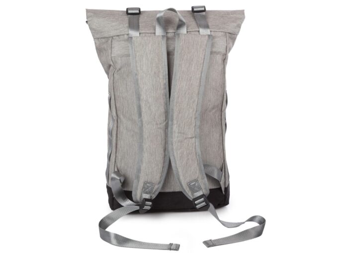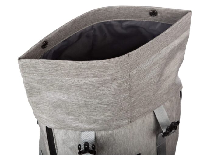 - Szary plecak na wycieczkę ze zwijanym kołnierzem.
