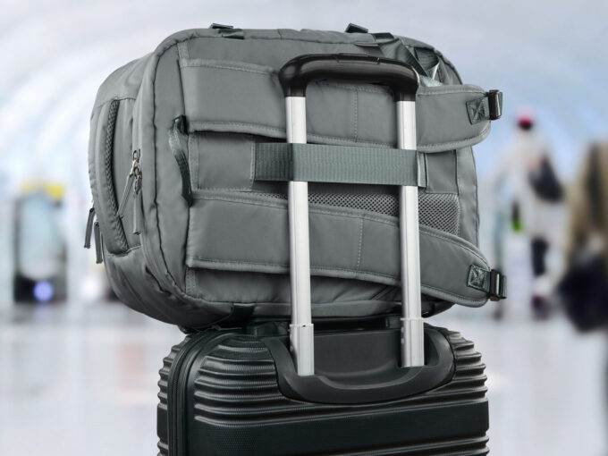 - Uchwyt do przymocowania plecaka do stelaża rączki walizki podróżnej.
