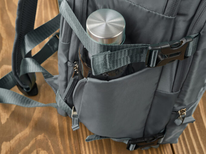 - Z boku umieszczono jeszcze kieszeń zapinaną na zamek na np. bidon z wodą.