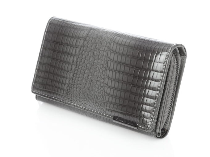 Elegancki, duży, szary portfel damski, marki Jennifer Jones. Model wykonany z lakierowanej skóry naturalnej, stylizowanej na skórę krokodyla. Portfel jest bardzo pojemny i wygodny w użytkowaniu. Posiada wewnątrz dodatkowy panel na karty bankomatowe oraz rabatowe zapinany na dodatkowy pasek z zatrzaskiem.