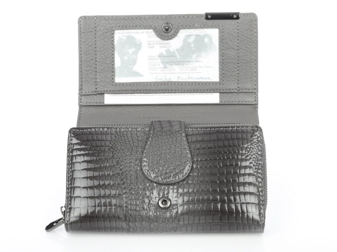 Elegancki lakierowany portfel damski Jennifer Jones w kolorze szarym z kieszenią na monety zapinaną na metalowy zamek błyskawiczny. Pełna specyfikacja ⬇