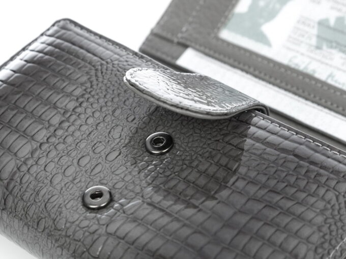 Pojemny skórzany damski portfel lakierowany z paskiem szary Jennifer Jones