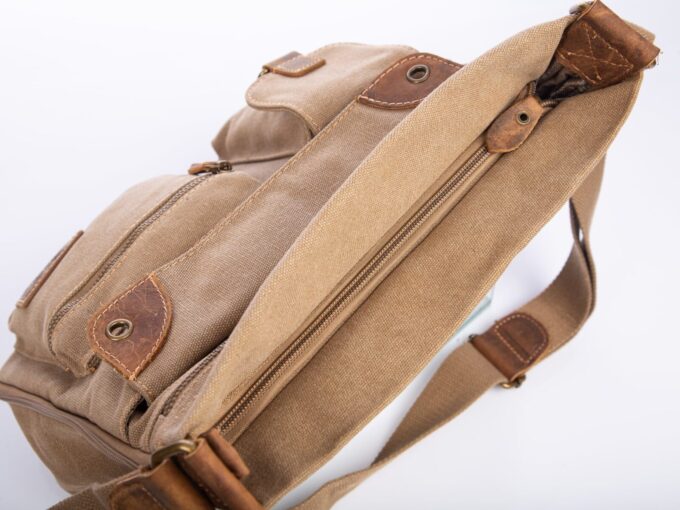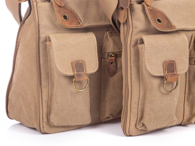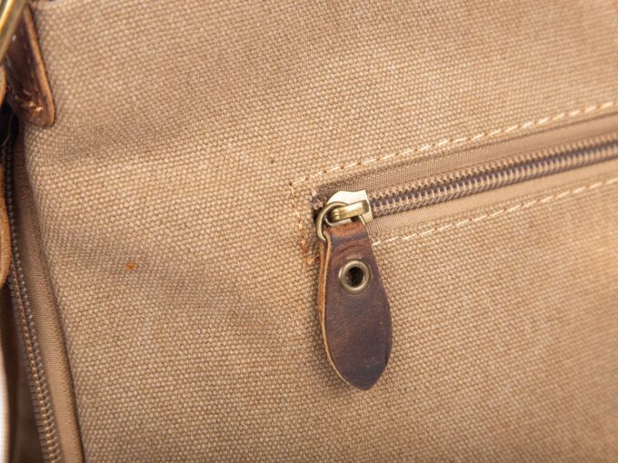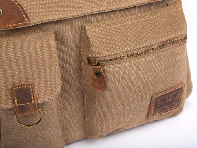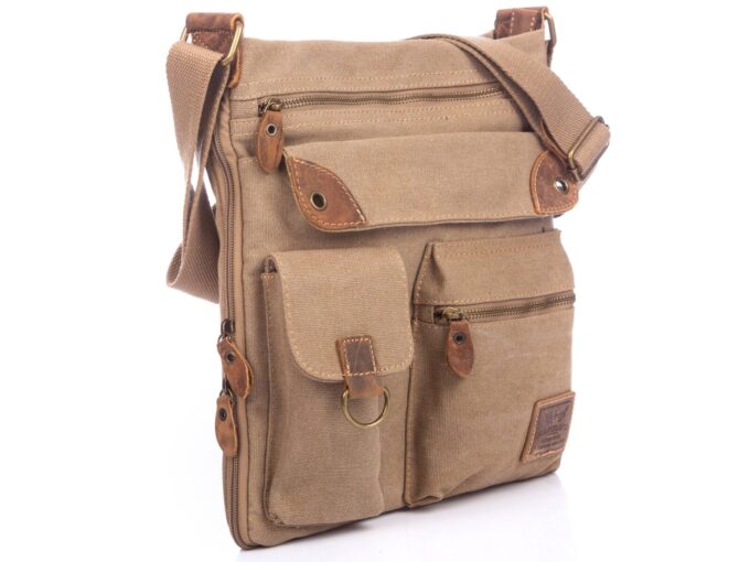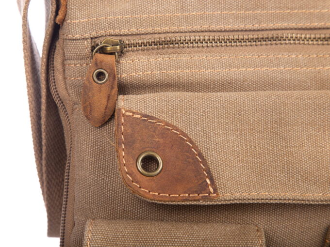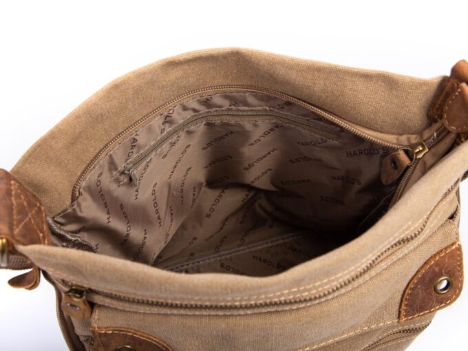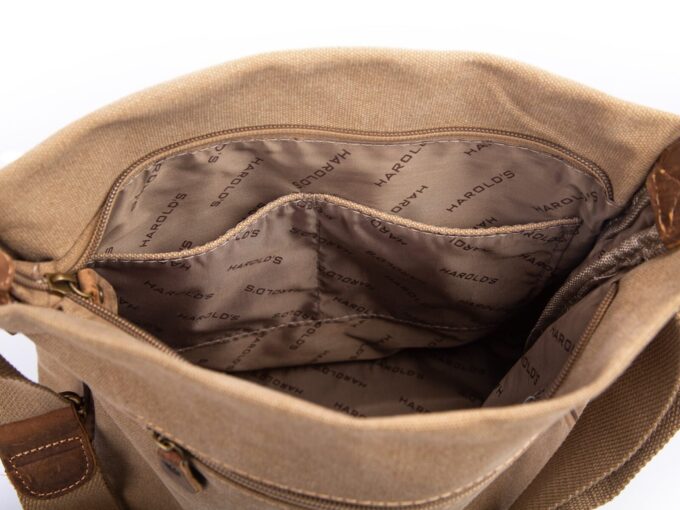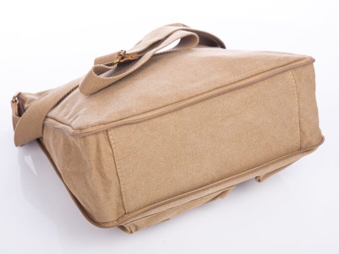 - Beżowa, poszerzana listonoszka damska, wykonana z mocnego materiału (Płótno – canvas) ze wstawkami ze skóry naturalnej,