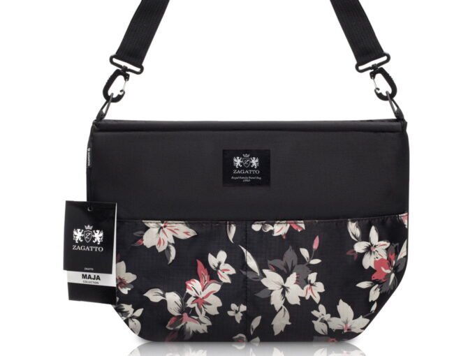 - Uniwersalna torba do wózka dziecięcego w kolorze czarnym z kolorowymi kwiatami.